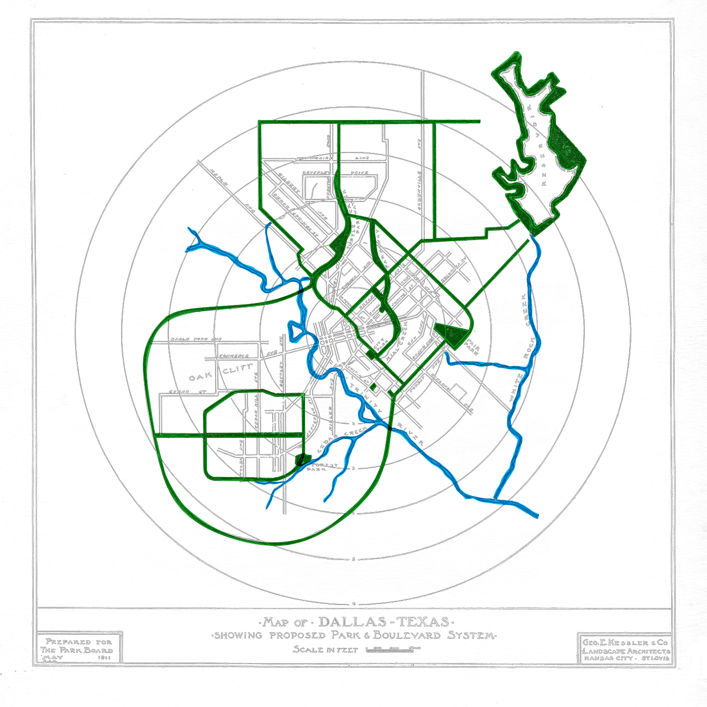 George Kessler’s 1911 A City Plan for Dallas was the first major urban planning effort in Dallas history. Aiming to address chaotic growth and flood control through public works which were not only practical, but also beautiful. A key focus was Turtle Creek, which Kessler proposed to preserve as a scenic parkway while also integrating it into a modern drainage system. To control flooding, channels and terraces were built along Turtle Creek’s natural contours, which were enhanced with stonework and landscaping that acted as both infrastructure and ornamentation.